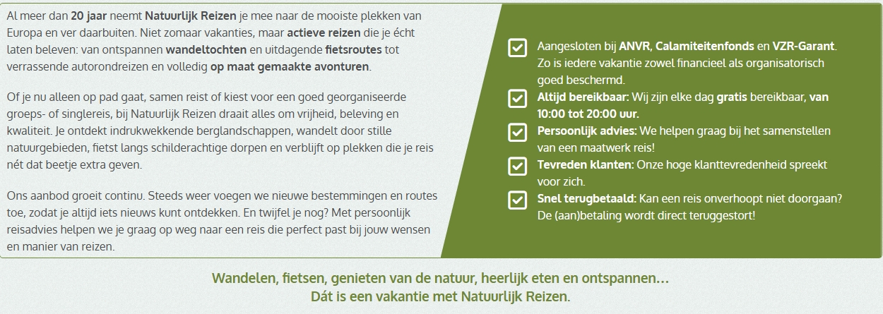 Of je nu kiest voor een groepsreis, singlereis, individuele reis of één van onze autorondreizen: met Natuurlijk Reizen beleef je jouw bestemming op een pure, authentieke en ontspannen manier. Reizen is meer dan het afvinken van bezienswaardigheden. Het is een beleving waarin je de tijd neemt om écht in contact te komen met de natuur, cultuur en de mensen van een regio. Dat is de essentie van Slow Travel: bewust reizen in een rustig tempo, met oog voor duurzaamheid, authenticiteit en verbinding.